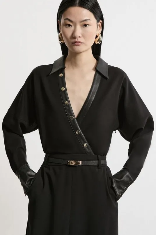Get day to night ready in our bodysuit, made in soft jersey fabric, with a relaxed silhouette, and contrasting faux leather detailing. Style it simply with tailored trousers and ankle boots or heels for a look that will take you from office days to evenings out.Collared V Neck Faux Leather And Ponte BodysuitHigh Quality Ponte FabricFlattering Relaxed FitShirt Style Bodice with Button DetailingDeep V NecklineFormal Collar AccentContrasting Faux Leather Collar and CuffsDetails & Care68% Viscose 27% Polyester 3% Elastane. Trim: 60% Polyurethane 40% Cotton. Gentle machine wash at 30 with similar colours. Model Height 5”10 – Model wears a S.