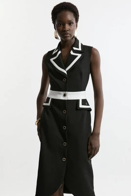 Compact Stretch Contrast Tipped Belted Tailored Midi Dress