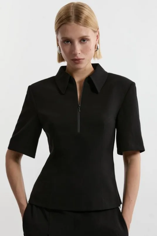 Elevate your day to night wardrobe in our collar top, featuring a fit that hugs the figure and zip detailing for a customisable fit. Styles well with jeans or shorts and trainers or boots for a multi seasonal outfit that can be worn again and again.Compact Stretch Essential Tailored Collar TopHigh Quality Stretch FabricComfortable, Fitted SilhouetteCasual, Short SleevesFormal Collar DesignZip Front DetailingDetails & Care69% polyester, 24% viscose, 7% elastane. Model wears UK10/US6. Model height:5″9. Length approx: 60cm