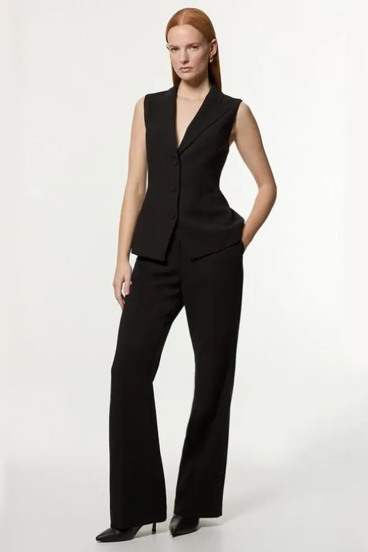 Experience sleek tailoring in a pair of straight leg trousers, with a flattering, relaxed fit and a comfortable high waistline. Style it with the matching waistcoat for a co-ordinating look, or with a knit jumper and boots for a more laid back approach.Compact Stretch Essential Tailored Straight Leg TrouserHigh Quality Tailored DesignComfortable High WaistlineFlattering Straight Leg FitPocket AccentsMatching Waistcoat Sold SeparatelyDetails & Caremain 69% polyester, 24% viscose/rayon, 7% elastane/spandex. lining 100% polyester. model height 5″9. model wears size 10. item length 108cm