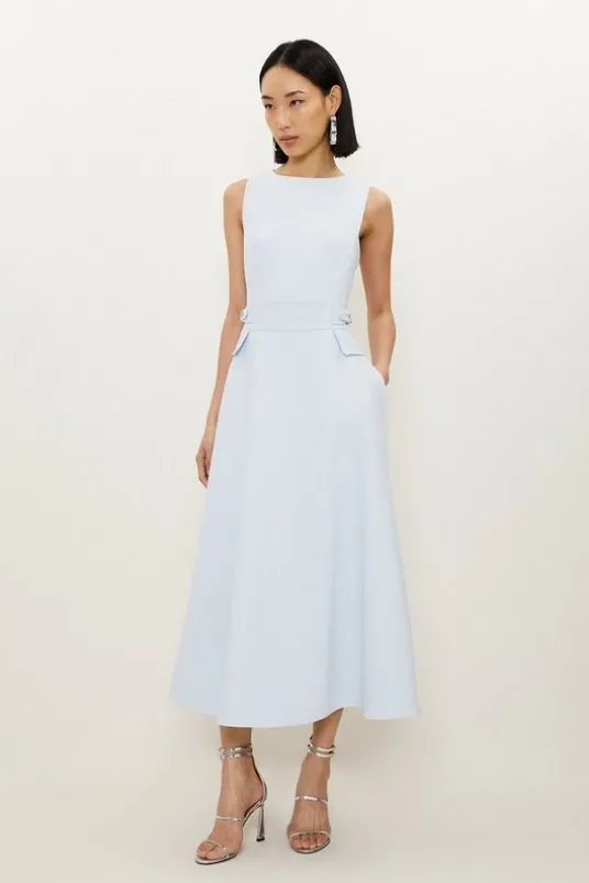 Experience everyday elegance in our midi dress, made with summer ready stretch fabric, with a fit and flare silhouette and tab details designed to cinch the waist. Style it with sandals or court heels for a look that will take you from summer office days to date nights.Compact Stretch Tab Waist Detail Full Skirt Midi DressHigh Quality Stretch FabricFlattering Fitted BodiceDramatic Flared SkirtUnique Tab Accents on WaistPocket DetailingSleeveless DesignZip Fastening in BackDetails & CareMain: 59% Polyester 31% Viscose/Rayon 5% Elastane/Spandex 5% Polyester. Lining: 100% Polyester. Dry clean only. Model wears UK Size 8/ US Size 4. Model height approx: 5″9. Length approx: 125cm