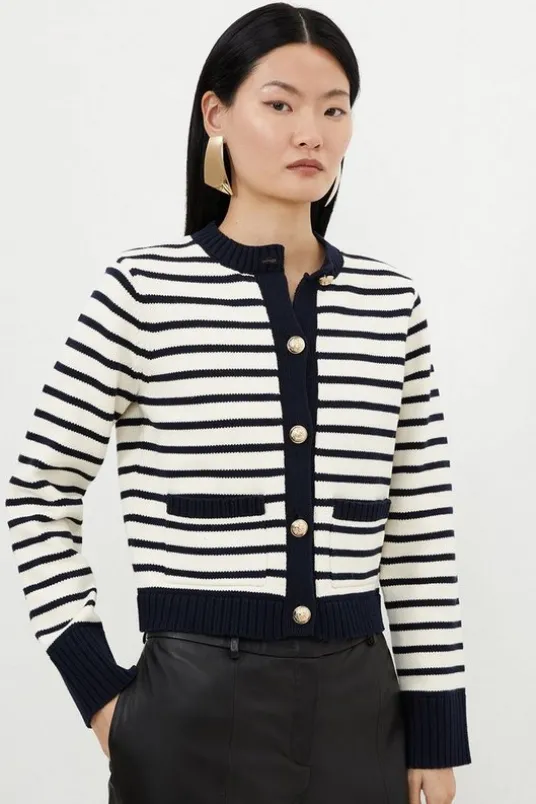 Invest in sumptuous knitwear with this cropped cardigan. Crafted from a cotton blend, adorned with a nautical stripe print for a trend-forward approach, while a boxy fit and polished buttons adds a timeless touch. Style this piece with a floppy knit skirt or weekend denim for an elevated casual ensemble.Stripe printPolished buttonsCroppedDetails & CareMain: 100% Cotton. 30 degree cotton cycle. Wash with similar colours. Model wears UK size Small. Models height approx: 5″9. Length approx: 52cm