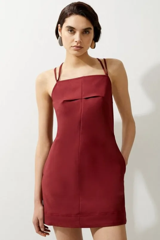 Elevate your every day wardrobe with our mini dress, with a bodycon fitting bodice which flows into a straight skirt, as well as a strappy back, and a squared neckline that accentuates the bust. Style it with strappy heels for an occasion look that is guaranteed to turn heads wherever you step, then with failsafe boots and tights, with a long sleeve top layered beneath for a cold weather look.Cotton Sateen Utility Woven Pinafore Mini DressHigh Quality Cotton Sateen FabricFigure Hugging FitStatement Strappy Back Squared Neckline Stitch Detailing at BustZip Back FasteningDetails & CareMain: 52% Cotton/ 44% Polyamide/ 4% Elastane. Gentle machine wash at 30. Do not dry clean. Model wears UK Size 8/ US Size 4. Model height approx: 5″9. Length approx: 92cm