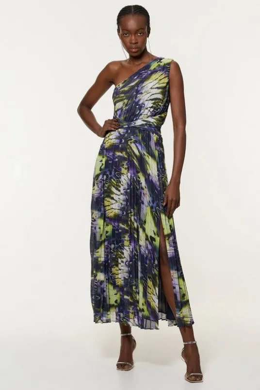 Demand attention in our maxi dress, with an entirely pleated design that creates enchanting movement as you walk, strut, or dance, as well as a unique feather print and an ultra flattering fit. Style it with strappy heels for an occasion look that is guaranteed to turn heads from wedding guest days to holiday evenings.Crinkle Feather Print Woven One Shoulder Maxi DressTextured, Pleated DesignStatement Feather PrintOne Shoulder FeatureFlattering Belted WaistThigh High Leg SplitZip Fastening on SideDetails & CareMain: 100% Polyester. Lining: 100% Polyester. Wash inside out. Model wears Size UK 10. Length measures 130cm.