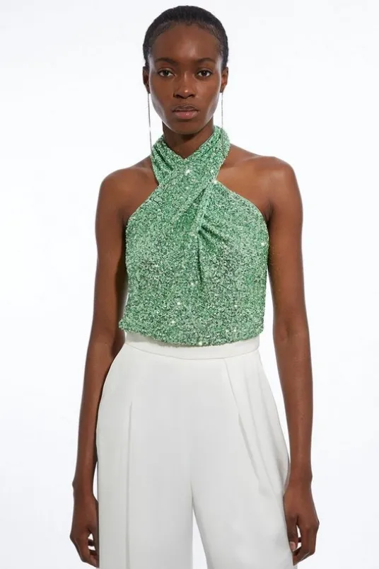 Celebrate summer in this feminine bodysuit. Featuring a sparkling sequin fabric, this bodysuit features a flattering fitted silhouette that hugs the body, and a supportive halter neckline with cut out detail at the front. It also features a breathable open back design, ideal for summer weddings or sun-drenched garden soirees. Wear yours with a voluminous full skirt or sleek linen trousers. Cross Neck Jersey Stretch Sequin Bodysuit Soft Jersey FabricPractical Halter NecklinePlayful, Sparkling Sequin DetailingFlattering Open BackButton Fastening Behind Neck Details & CareMesh: 95% Polyester/ 5% Elastane. Sequin: 100% Polyethlene. Gentle machine wash at 30. Do not dry clean.Model Height 5”10 – Model wears a UK 8/US Size 6.