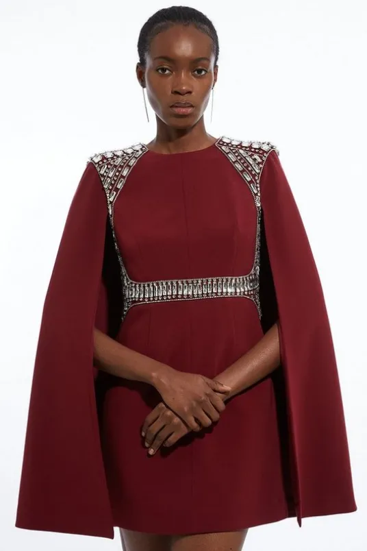 Feel like the centre of attention in our mini dress, which features a fit that hugs the curves, embellishments in a body contouring shape, and a unique cape feature that brings the drama. Styles well with strappy heels for a statement occasion look, perfect for wedding reception dresses, and formal occasions.Crystal Embellished Cape Detail Mini DressSparkling Crystal DetailingStatement Cape FeatureFigure Skimming FitBody Contouring EmbellishmentsStructured ShouldersZip Fastening in BackDetails & CareMain 91% Polyester, 9% Elastane/Spandex. Lining 90% Polyester, 10% Elastane/Spandex. Model height 5’9. model wears size s. Length 89cm