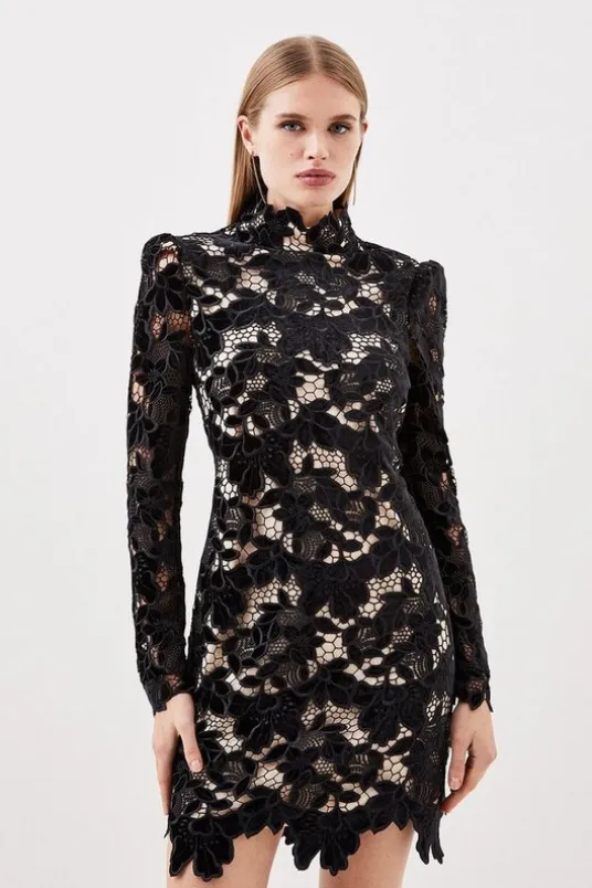 Adorned with intricate woven detail, this mini dress is crafted from satiny velvet, with expert cutwork floral detail from a high neck, long sleeves and detailed hem. Pair this piece with heels or boots for elegant evening wear.Mini dressCutworkLong sleevesFloralDetails & Care100% polyester. Gentle machine wash at 30 with similar colours. Model Height 5”10 – Model wears a UK 8/US Size 6. Centre back length of a size 10: 90cm