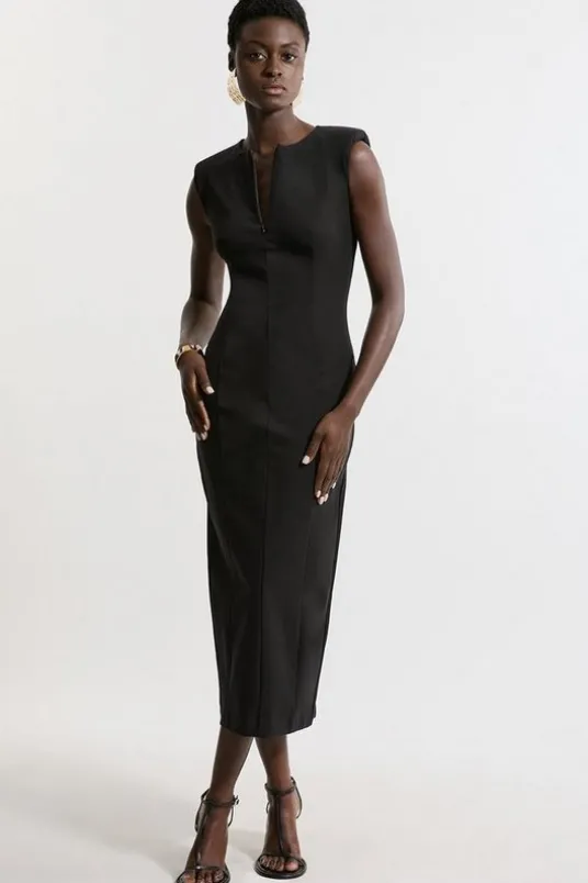 Feel occasion ready in our midi dress, made with ponte fabric, featuring a figure hugging fit and a plunge neckline with a zip accent for a fully customisable fit. Style this piece strappy heels for a look that goes seamlessly from party nights to holiday evenings.Dart Detail Luxe Ponte Jersey Midi DressHigh Quality Ponte FabricUnique, Structured ShouldersStatement Plunging V Neckline with Zip FasteningFigure Hugging BodiceStraight Hanging SkirtDarted Detailing for a Cinched WaistlineZip Back FasteningDetails & Care49% modal/cupro/rayon 45% cotton 6% elastane/spandex. Gentle machine wash at 30 with similar colours. Model Height 5”10 – Model wears a UK S. Length- 126cm