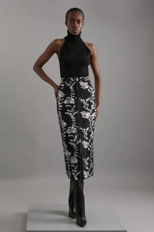 SkirtsDenimCLOTHINGNEW INLast Chance to BuyFloralsDenim SkirtsElevate your occasion wear wardrobe with our denim midi skirt, with a fitted silhouette, and a sparkling, floral detailing which gives a unique edge. Style it with the matching jacket and strappy heels for an occasion look that is guaranteed to turn heads wherever you step.Denim All Over Floral Sequin SkirtHigh Quality Denim FabricStraight SilhouetteSparkling Sequin EmbellishmentsComfortable, High WaistlineThigh High Leg Split in Front Matching Jacket Sold SeparatelyDetails & CareBody: 100% cotton. Lining :100% polyester. Model wears UK10/US6. Model height 5″9. Length approx: 115cm