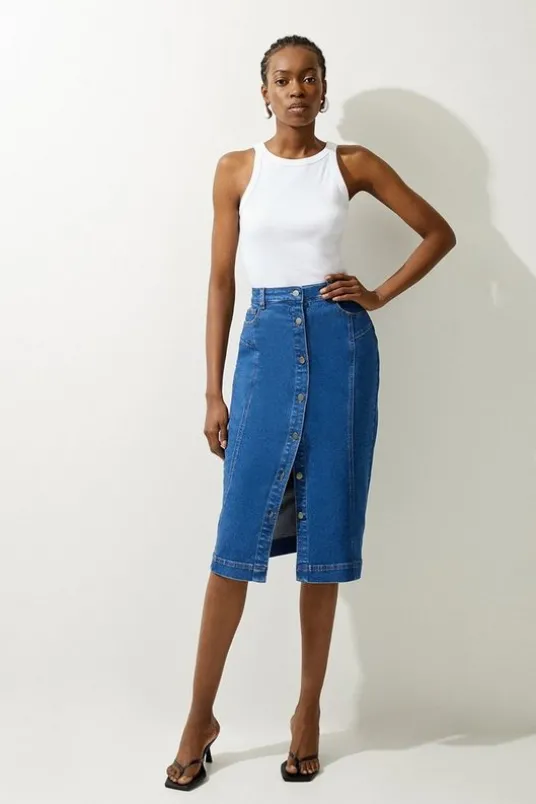 Feel confident in our midi skirt, made in high quality denim fabric, featuring a straight fit and a high waistline for a universally flattering fit, and buttons down the centre. Style it with court heels or ankle boots for a look perfect for office days, then wear it with heeled boots for an evening look.Denim Button Through Midi SkirtHigh Quality Denim FabricFlattering Straight FitOptional Leg Split in Front Comfortable, High Waistline Pocket FeaturesButton Front FasteningsDetails & Care98% Cotton 2% Elastane. Wash with similar colours. Cool iron on reverse. Wash inside out. Model wears UK Size 8/ US Size 4. Model height approx: 5″9. Length approx: 80cm
