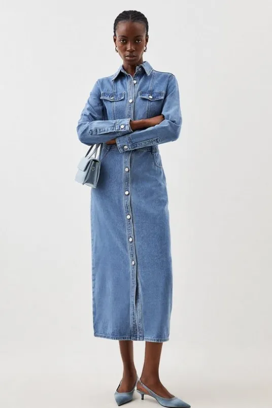 A timeless staple that can be worn from desk to dinner, this dress features a classic shirt style. Tailored with premium denim for a fitted appearance, with a fly collar, long sleeves and patch pocket detailing. Pair this piece with kitten heels for elevated workwear.Shirt styleMidi dressPocket detailLong sleevesDetails & Care59% Cotton 23% Viscose/Rayon 18% Polyester. Wash before wear to reduce the possibility of colour transfer. Wash dark colours separately using non-biological liquid detergent. Avoid contact with light colours as colour may transfer. Due to the nature of the dyeing process there may be some colour transfer onto garments and upholstery. Iron on reverse. Model wears UK Size 8/ US Size 4. Model height approx: 5″9. Length approx: 135cm