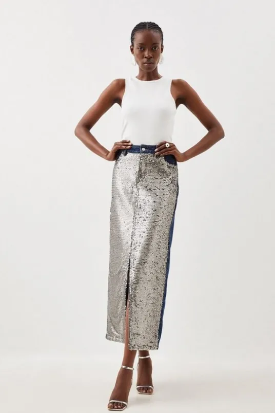 Feel confident in our maxi skirt, made in high quality denim fabric, featuring a statement sequin panel in the front, a straight fit and a high waistline for a universally flattering fit. Style it with a blouse an heels for an elevated evening look, then a T-shirt and trainers for a more casual approach.Denim & Sequin Maxi SkirtHigh Quality Denim Fabric Sparkling Sequin Panel Flattering Straight FitThigh High Leg SplitComfortable, High WaistlinePocket FeaturesButton Front FasteningDetails & CareMain 1: 85% Cotton 10% Viscose/Rayon 5% Polyester. Main 2: 100% Polyester. Wash with similar colours. Wash inside out. Iron on reverse. Model wears UK Size 8/ US Size 4. Model height approx: 5″9. Length approx: 102cm