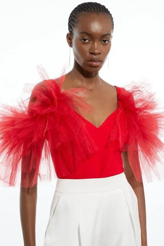 Prepare for admirable glances with this standout bodysuit. With a figure-hugging bodycon fit, and dramatic tulle detail across the shoulders, this bodysuit is set to stand out. Style with tailored trousers and strappy stilettos for an after-dark look.Drama Ponte And Tulle Strappy Jersey BodysuitSoft Jersey FabricStatement Tulle DetailingDeep V NecklineFlattering Off the Shoulder FinishBodycon SilhouetteDetails & Care68% Viscose/Rayon 28% Polyamide 4% Elastane/Spandex. Main & Contrast: 100% Cotton. Gentle machine wash at 30 with similar colours. Do not dry clean. Model Height 5”10 – Model wears a S.