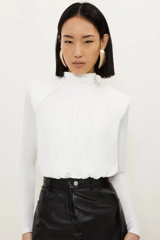 A versatile piece crafted with structured form, this piece is crafted from jersey crepe that drapes the silhouette. Featuring power shoulders and a high neck for a confident touch, finished with long sleeves.Crepe fabricHigh neckLong sleevesDetails & Care95% Polyester 5% Elastane. 30 degree synthetic cycle. Model wears UK Small.