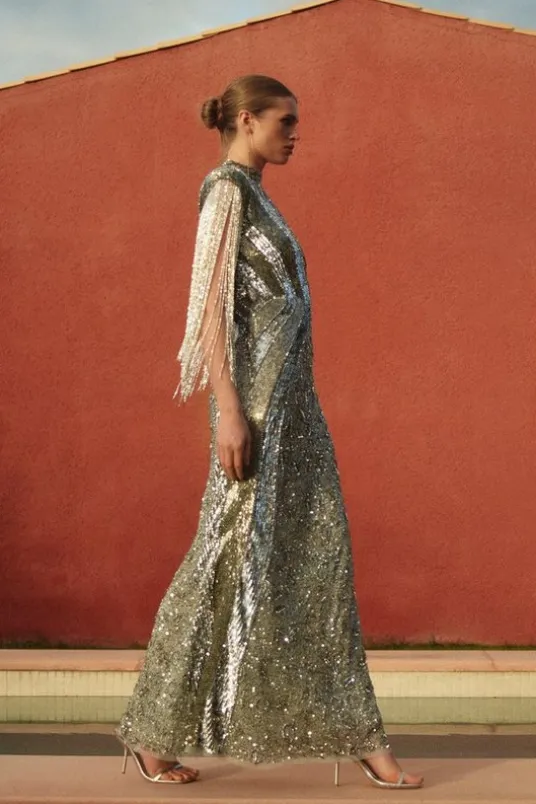 Feel formal in our maxi dress, with sparkling, beaded detailing, cut out accents on the back and the bust, and a tassel cape design on the shoulders. Styles well with strappy heels for a statement occasion look, perfect for ladies day, prom night, and formal occasions.Embellished Beaded Cap Sleeve Woven Maxi DressSparkling Beaded EmbellishmentsStatement Geometric DetailingUnique Tassel Cape Design on ShouldersKeyhole Accent on BustCut Out BackFit and Flare SilhouetteButton and Zip Fastenings in BackDetails & CareShell: 100% Polyester. Lining: 100% Polyester. Beads: Glass.Hand wash separately in cool water using non-biological liquid detergent. Do not dry clean. Model Height 5”10 – Model wears a UK 8/US Size 6. Centre back length of a 8: 150cm
