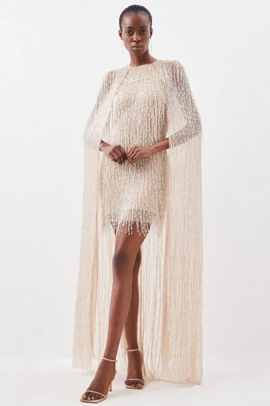 Tactile and ornate, this embellished midi dress is shaped for a close-fitting silhouette that is overlaid by a floor-length fringe cape. Style this opulent piece with stilettos for a polished ensemble.EmbellishedRound neckLong sleevesTassel capeMini hemDetails & CareShell: 100% Polyester. Lining: 100% Polyester. Beads: Glass.Hand wash separately in cool water using non-biological liquid detergent. Do not dry clean. Model Height 5”10 – Model wears a UK 8/US Size 6. Centre back length of a 8: 185cm