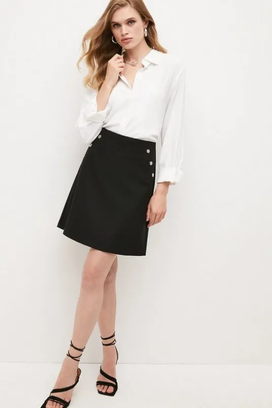 Feel casual in our mini skirt, with a universally flattering straight fit and a high waistline, and metallic button detailing on the hips. Pair it with a knit jumper or blouse and loafers for an elevated daytime look, perfect for year-round wear.Essential Techno Woven SkirtHigh Quality Woven FabricFlattering Straight FitComfortable High WaistlineMetallic Button DetailingDetails & Care50% Cotton, 47% Polyamide, 3% Elastane. Gentle machine wash at 30 with similar colours. Model Height 5”10 – Model wears a UK 8/US Size 6. Length 95cm