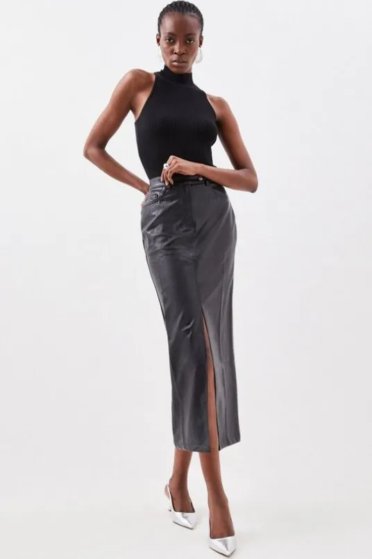 Allow this closet staple to provide an instant update to everyday rotations. Crafted with premium leather, this midi skirt emsuspenders an off-duty aesthetic, while corset-style seaming adds dimension to the piece. Belt loops and lapels add understated detailing this piece. Style this skirt with heels and a crop top to exude understated elegance at your next event.Midi hemlineLeatherFront leg slitZip fasteningDetails & Care60% Polyurethane 40% Cotton. Cool hand wash in mild detergent. Reshape whilst damp. Wash inside out. Cool iron on reverse. Avoid contact with abrasive surfaces. Model wears UK Size 8/ US Size 4. Model height approx: 5″9. Length approx: 90cm