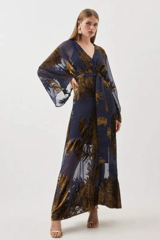 Experience elevated occasion wear in our maxi dress, featuring lightweight devore fabric and a relaxed, flowing silhouette, met with a universally flattering V neckline and statement, wide sleeves. The sparkling, beaded feathers makes this piece a dazzling evening item, so pair it with loafers or heels for an elevated night out look.Feather Devore Woven Kimono Maxi DressHigh Quality Devore FabricStatement Kimono SleevesDeep V NecklineBelted WaistlineComfortable, Flowing SilhouetteSparkling, Beaded EmbellishmentsUnique Feather DesignDetails & Care51% Viscose/Rayon 49% Polyamide. Professionally dry clean. Model Height 5”10 – Model wears a UK 8/US Size 6. Centre back length of a 8: 150cm