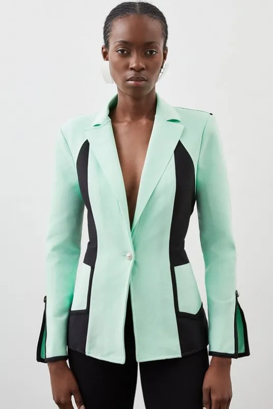 A contemporary take on timeless silhouettes, this blazer sculpts the silhouette with figure form bandage. Featuring a stand out color block design that contrasts a notched collar, patch pockets and split long sleeves. Pair this trend-forward piece with tailored pants for an elevated and playful formal attire.Notched collarColour blockOne button designDetails & CareMain: 97% Recycled Polyester 3% Elastane/Spandex.Wash with similar colours. Model wears UK Size S. Model height approx: 5″9. Length approx: 68cm