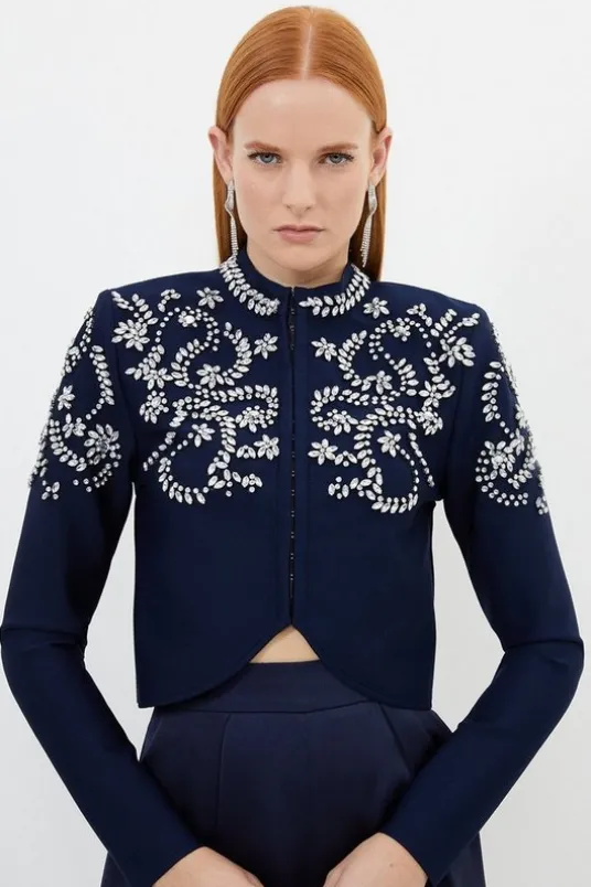 Elevate your outer layers with an understated yet elegant jacket, with a comfortable, straight fit, a high neckline, and embellished detailing across the chest and shoulders. Style it with anything, from tailored trousers, to jeans for an elevated look that will take you seamlessly from day to night.Figure Form Bandage Embellished Cropped Knit JacketHigh Quality, Soft Knit FabricRelaxed SilhouetteCropped LengthSparkling Embellishments Formal, High Neckline Unique, Curved HemlineZip Front FasteningDetails & Care97% polyester 3%elastane. Wash with similar colours. Model wear UK Small.