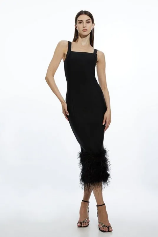 Experience opulence in our midi dress, made in knit fabric, with a bodycon fit, and a flirty feather trim. The thigh high leg split in the back makes for easy movement, as well as a head turning outfit on every angle. Style it with strappy heels for an occasion look that will take you from holiday evenings to party nights.Figure Form Bandage Feather Hem Knit Midi DressHigh Quality, Soft Knit FabricFlattering Figure Hugging FitSquared NecklineComfortable, Wide Shoulder StrapsFun Feather Trim at HemlineThigh High Leg Split in BackZip Fastening in BackDetails & Care97% recycled polyester, 3% elastane. dry clean in mild solvent. model wears UK S.