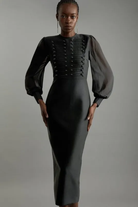 Figure Form Bandage Knit Chiffon Sleeve Military Trim Midaxi Dress