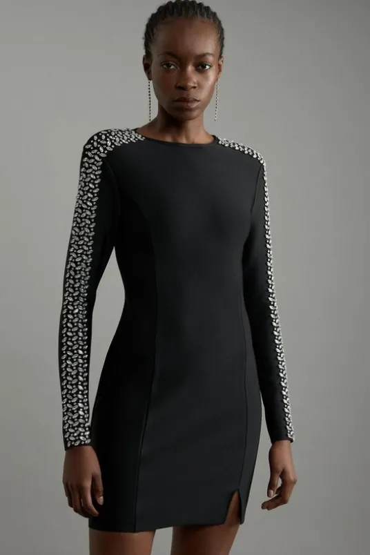 Make a statement in our mini dress, which features a bodycon silhouette, and sparkling embellishments down the long sleeves. The sparkling crystals add unique texture to an evening look. Style this dress with strappy heels for an outfit that will turn heads from party nights to upcoming occasions and events.Figure Form Bandage Knit Embellished Mini DressHigh Quality, Soft Knit FabricStatement Embellished DetailingFlattering Figure Hugging SilhouetteSmall Leg SPlit AccentZip Back FasteningDetails & Care97% recycled polyester, 3% elastane. cool hand wash only. model wears a Small. models height is approx 5″7. centre back length is 88cm