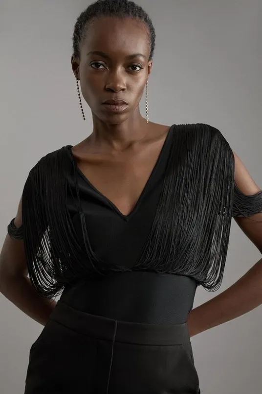 Embellish your evening wardrobe in our fringe top, with draped fringe detailing across the bust and shoulders. Style this piece with tailored trousers and strappy heels for an outfit that goes seamlessly from party nights to festive evenings.Figure Form Bandage Knit Fringe Detail TopHigh Quality Knit FabricStatement Fringe Detailing Across BustDeep V NecklineDraped Fringe SleevesTie Fastening in BackDetails & Care97% recycled polyester, 3% elastane. 30 degrees synthetic cycle. model wears a Small.