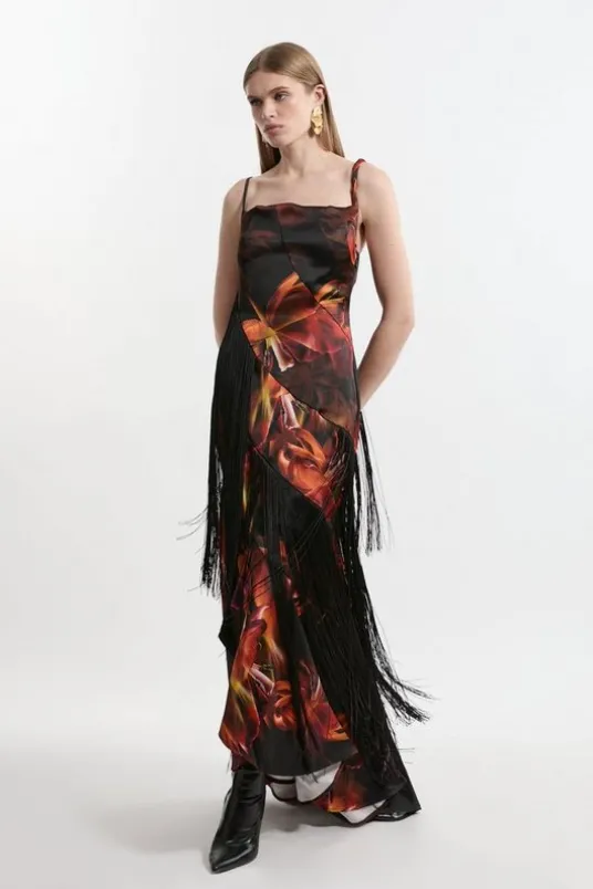 Floral Heavy Satin Panelled Fringed Woven Strappy Maxi Dress