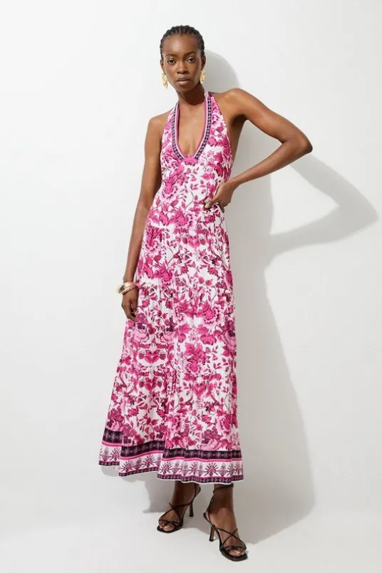 Experience elevated summer looks in our maxi dress, which features a universally flattering, relaxed silhouette, a vibrant, summery print, and a statement plunge neckline. Style this piece with anything, like block heels for a casual daytime look, then with sandals for a holiday outfit that will take you from day to night.Floral Printed Viscose Woven Halter Maxi DressHigh Quality Viscose FabricFlattering Flared SilhouettePlunging V NecklineStatement Low BackVibrant Floral PrintTie Back FasteningDetails & Care100% Viscose . Gentle machine wash at 30 with similar colours. Model Height 5”10 – Model wears a UK 8/US Size 6. Centre back length of a 10: 166 cm