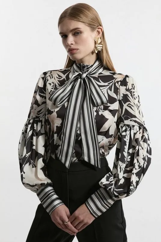 Striking floral print woven blouseElegant tie neck detail with contrasting stripesVoluminous balloon sleeves with fitted cuffsHigh neckline for a sophisticated lookLoose fit for comfort and versatilityThis Karen Millen blouse radiates contemporary elegance with its bold floral print and striking tie neck detail. The contrasting striped tie adds a touch of drama, while the voluminous balloon sleeves create a romantic silhouette. Perfect for the polished woman who appreciates expert craftsmanship, this piece can effortlessly transition from day to evening. Style it with tailored trousers and pointed flats for a chic office ensemble, or pair it with a sleek pencil skirt for family gatherings. The loose fit ensures comfort without compromising on style, making it an ideal choice for various casual events. Accessorise with statement earrings to complement the high neckline and enhance the blouse’s sophisticated charm.Details & CareMain: 100% Polyester. Model wears UK Size 10.