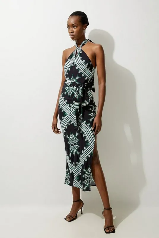 Bring in the summer with our maxi dress, with a fit that flatters the curves, and a statement geometric print. The twisted halter neckline elevates the formality, while the thigh high leg split makes for a statement piece. It is adorned with detailed, in-house designed print work, and can easily be styled with a pair of sandals or heels.Geo Printed Morocain Woven Maxi DressHigh Quality Morocain FabricComfortable Figure Skimming FitUnique Geometric PrintTwisted Halter NecklineThigh High Leg SplitBelted WaistlineTie Back FasteningDetails & CareMain: 100% Viscose/Rayon. Wash at 30 degrees.