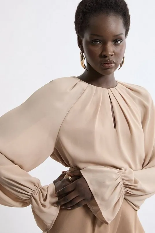 Add a little formality in our blouse, with a relaxed fit, and trumpet sleeves. This piece pairs well with anything, from a flowing maxi skirt, to tailored trousers, to jeans for an elevated look that will take you seamlessly from day to night.Georgette High Neck Keyhole Woven BlouseHigh Quality Georgette FabricPlayful, Trumpet SleevesKeyhole Accent at BustHigh Neckline Floaty, Relaxed Fit Button Fastening Behind NeckDetails & CareMain; 100% polyester Lining; 100% polyester. Gentle machine wash at 30 with similar colours. Wash inside out. Model wears a UK 8/US Size 6. centre back of size 8 .length: 60cm