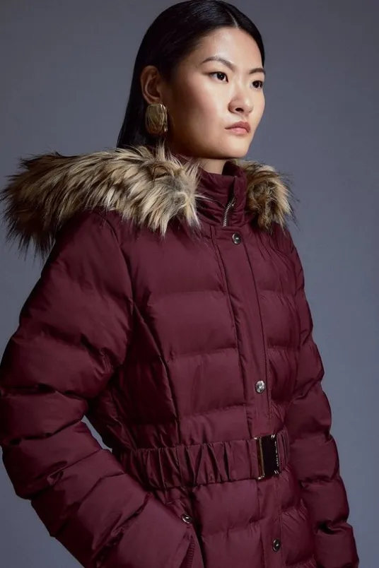 Heat Seal Puffer Belted Faux Fur Hood Longline Jacket