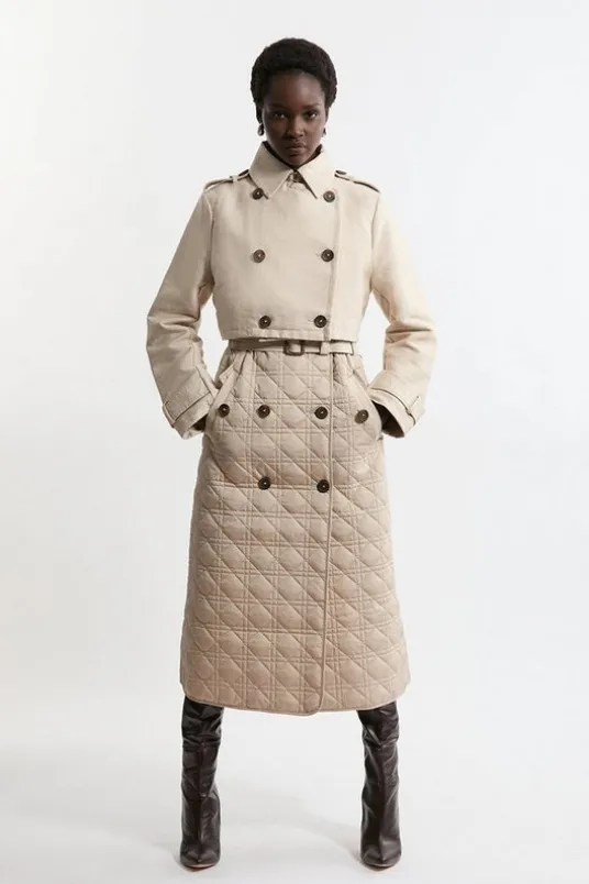 Feel elevated no matter the weather in our trench coat, made in high quality, thick quilted fabric, featuring a fit that flatters the figure. The double breasted buttons and collared neckline make for a classic, traditional piece that maintains a heightened level of formality. Wear it over any outfit, whether heading out for dinner or to the office.Hybrid Quilted Belted Trench CoatHigh Quality Quilted FabricFlattering Fitted SilhouetteBelted WaistlineClassic Double Breasted ButtonsPocket FeaturesFormal, Collared NecklineDetails & CareShell 50% polyester, 45% cotton, 5% nylon. Lining 100% Recycled polyester. Model wears UK10/US6, Model height 5″9. Item length 130cm