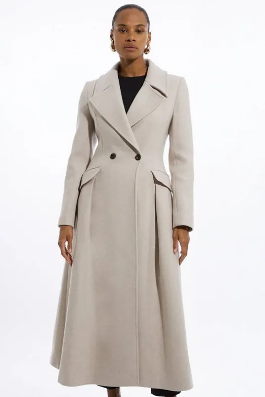 Feel elevated no matter the weather in our midaxi length coat, made in high quality, thick Italian wool, featuring a classic, double breasted style, and a statement flared silhouette. Wear it over any outfit, whether heading out for dinner or to the office.Italian Wool Blend Tailored Flared Skirt Midaxi CoatHigh Quality Italian Wool FabricFlattering Fit and Flare SilhouetteClassic Trench StyleSimple, Double Breasted Button DetailingPocket Features V Neckline Tab Accent in Back Long, Midaxi Length Statement, Flared SkirtDetails & CareMain: 70% Wool. 30% Polyamide. Lining: 100% Polyester. Dry clean only. Item Length 125cm.