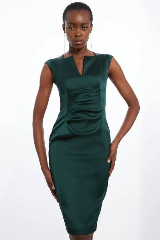 Italian Satin Tailored Envelope Neck Pencil Midi Dress