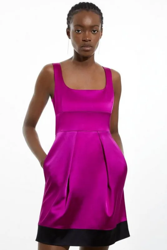 Feel confident in our mini dress, made in shining satin fabric, featuring an ultra minimal design, with a figure hugging fit that flares out into a short skirt. Style it with strappy heels for an evening look that you will keep reaching for.Italian Structured Satin Colourblock Tailored Lantern Mini DressHigh Quality Italian Satin FabricFlattering Figure Hugging BodiceFeminine Flared Skirt Squared Neckline Statement Colourblock PatternPocket FeaturesZip Fastening in BackDetails & Caremain 75% acetate, 22% polyamide, 3% elastane/spandex. lining 100% polyester. dry clean only. model height 5’9. model wears size 10/us 6. Item length 89cm