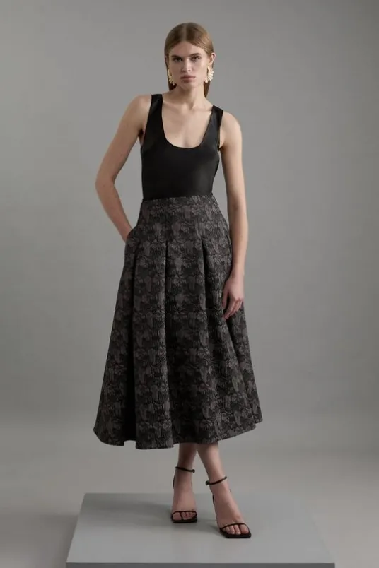 With a romantic twist, this formal skirt is crafted from a textured fabric that immediately catches the eye, making it perfect for all those special occasions. This enchanting full skirt is cut to a high waist and features a midi length that sits midway down the calves and skims the hips for a flattering fit. Indulge in elevated formality and style with the matching top for an eye-catching look. Jacquard Tailored Prom Midi Skirt High Quality Jacquard FabricFull Skirt for Maximum MovementComfortable, High Waist DesignSubtle, Monochrome PrintZip Fastening in BackMatching Top Sold SeparatelyDetails & Care90% polyester, 5% elastane, 5% metallised fibre. Lining 100% polyester. Model wears UK10/US6. Model height 5″9. Length approx: 95cm