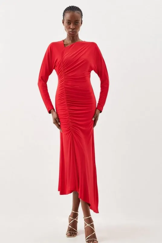 Jersey Crepe Ruched Long Sleeve Midi Dress