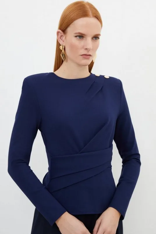 Prepare for admirable glances with this standout top. With a figure-hugging fit, ruched, twisted detailing, and dramatic structured shoulders decorated with metallic hardware, this top is set to standout. Style with tailored trousers and strappy stilettos for a statement party look.Jersey Ponte Twist Hardwear TopSoft Jersey FabricStatement Structured ShouldersHigh, Round NecklineRelaxed, Twisted DetailingMetallic Hardware AccentsFigure Hugging SilhouetteZip Fastening in BackDetails & Care68% Viscose 27% Polyester 3% Elastane. Gentle machine wash at 30 with similar colours. Model Height 5”10 – Model wears a S.