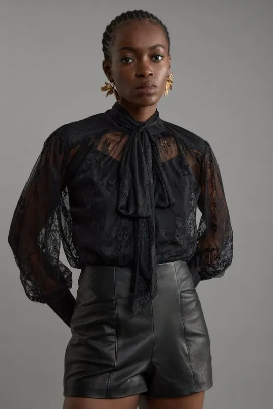 Fall ’24: Allow our latest collection of autumn pieces to inspire you for the season ahead. Elevate your summer wardrobe in our shorts, with fit that hugs the curves, a minimal design, and a notched waistline. Style it with anything, from a button up shirt for an elevated look that will take you seamlessly from day to night, to a T-shirt for a more relaxed approach.Leather Notch Detail Mini ShortsSleek, Real Leather FabricStatement Bodycon FitComfortable High WaistlineNotched Detail at WaistSleek, Minimal DesignDetails & Care100% Leather. Lining: 100% Polyester. Model wears UK Size 8/ US Size 4. Model height approx: 5’9. Item length 40cm