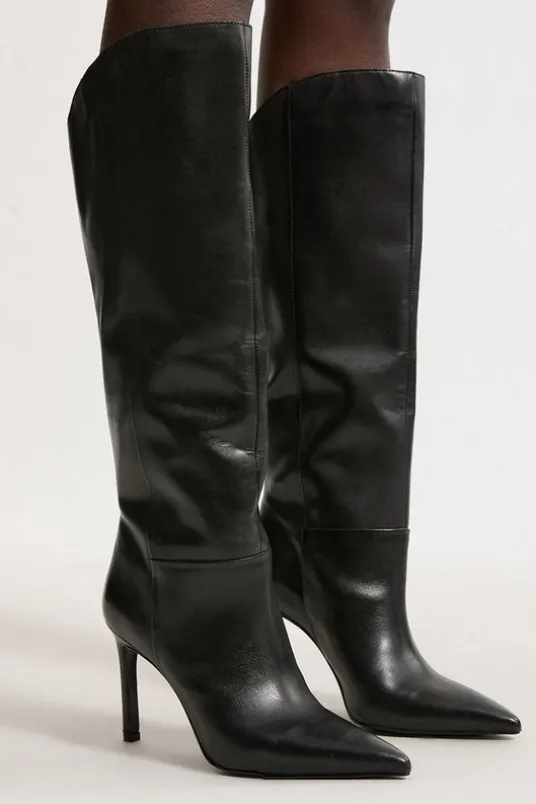 Emanate confidence in our knee high boots, made in supple, real leather, featuring slender, high heels and pointed toes. The sleek design makes them easy to style with anything, from jeans and a knit jumper for casual coffee catch up, to tailored wide leg trousers for an elevated edge.Leather Pointed High Heel Knee High Western BootsHigh Quality Real LeatherStriking, Stiletto HeelsFierce Pointed ToesKnee High LengthDetails & CareLining: Premium Leather, Upper lining: Premium Leather, Sole: Resin, Insole: Premium Leather, Upper: Premium Leather.