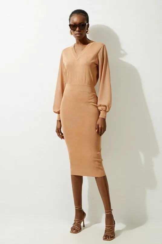 Step out in confidence in our summer dress, which is made with comfortable, ultra lightweight knit fabric, and features a relaxed fit bodice that flows to a figure hugging skirt, and a V neckline. Wear it with sandals or strappy heels for a look ideal for evening plans and occasions.Light Weight Summer Knit Midi Pencil DressHigh Quality, Lightweight Knit FabricSleek, Minimal DesignV NecklineRelaxed BodiceFigure Hugging SkirtLong Balloon SleevesDetails & Care89% viscose, 11% polyamide. wash with similar colours. model wears a small. models height 5″7. centre back length 130cm.