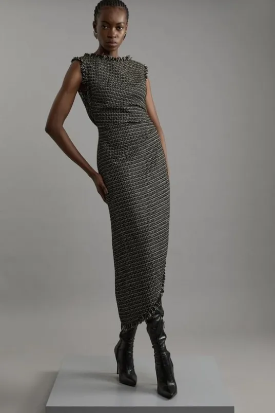 Metallic Boucle Tailored Ruched Midi Dress