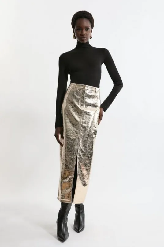 Metallic modernity defines this midi skirt. A classic design is reimagined with the lustrous vision of coated faux leather that creates captivating depth. Style this skirt with a crop top and heels for a unique and trend-forward party outfit.Metallic designFaux leatherMidi hemlineSide pocketsDetails & CareMain: 90% Elastane/Spandex 10% Polyester. Lining: 90% Nylon 10% Elastane/Spandex. Dry clean only. Model wears UK Size 8/ US Size 4. Model height approx: 5″9. Length approx: 95cm