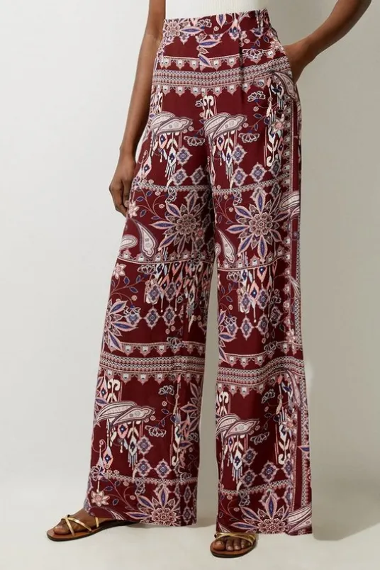 PrintsCLOTHINGPantsCYBER DEALSSALEWelcome the warmer months with lightweight viscose trousers in a dark but vibrant print. Featuring a high waist that defines the waist, these printed trousers are a relaxed fit ideal for laidback days in the sun. Style this piece with a bikini and strappy sandals for a holiday outfit that goes seamlessly from day to night, or pair with the matching shirt for the ultimate eye-catching look.Mixed Print Viscose Crepe Woven High Waisted TrousersStatement, Vibrant PrintComfortable High WaistlinePocket Features Flattering Wide Leg Fit Matching Shirt Sold SeparatelyDetails & CareMain: 100% Viscose/Rayon. Wash at 30 degrees. Model wears Size UK 10. Length measures 82cm
