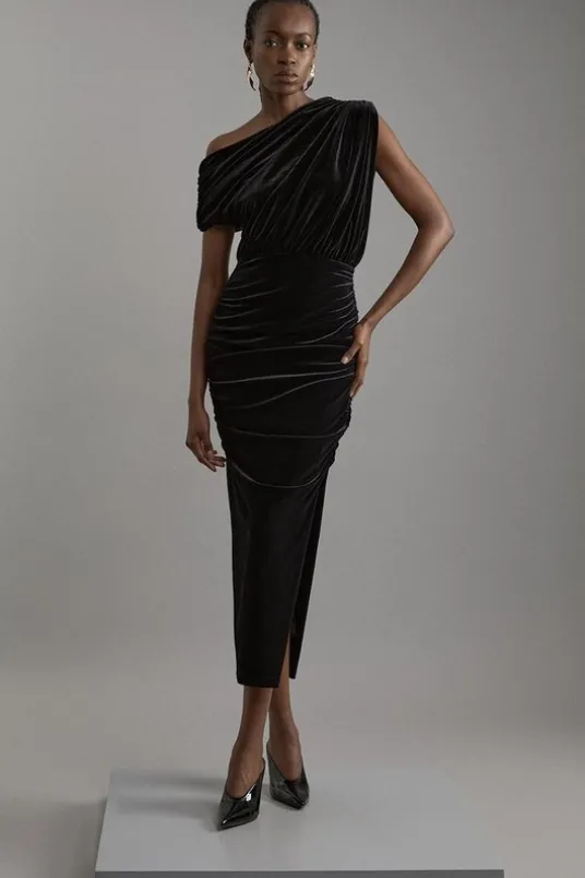 One Shoulder Jersey Draped Midi Dress