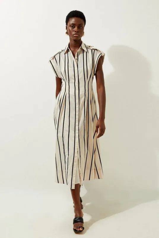Embrace effortless elegance with this shirt dress. Ideal for days that require something a little different, this organdie dress features a flattering silhouette that cinches at the waist, as well as sleeves that can be fastened up or worn down offering up endless styling opportunties. Style with strappy sandals for a sophisticed summer look.Organdie Monochrome Stripe Woven Shirt DressHigh Quality Organdie FabricButton Down FasteningCapped SleevesCinched WaistlineMonochromatic Stripe PatternDetails & Care82% cotton, 18% polyamide. 30 degree synthetic cycle, do not dry clean or tumble dry. Model wears UK 10, center back app 130cm